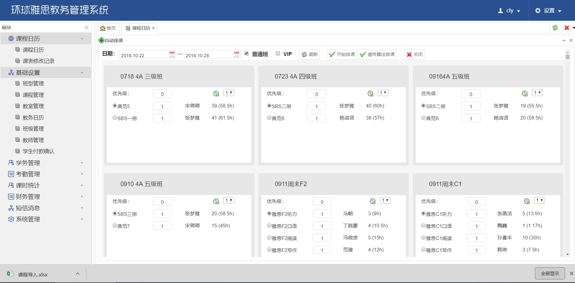 1、智能排課:基于遺傳算法進行演化式智能排課,綜合教務日歷、課程設置、班級、教室、教師等因素自動尋找最優(yōu)化解決方案;