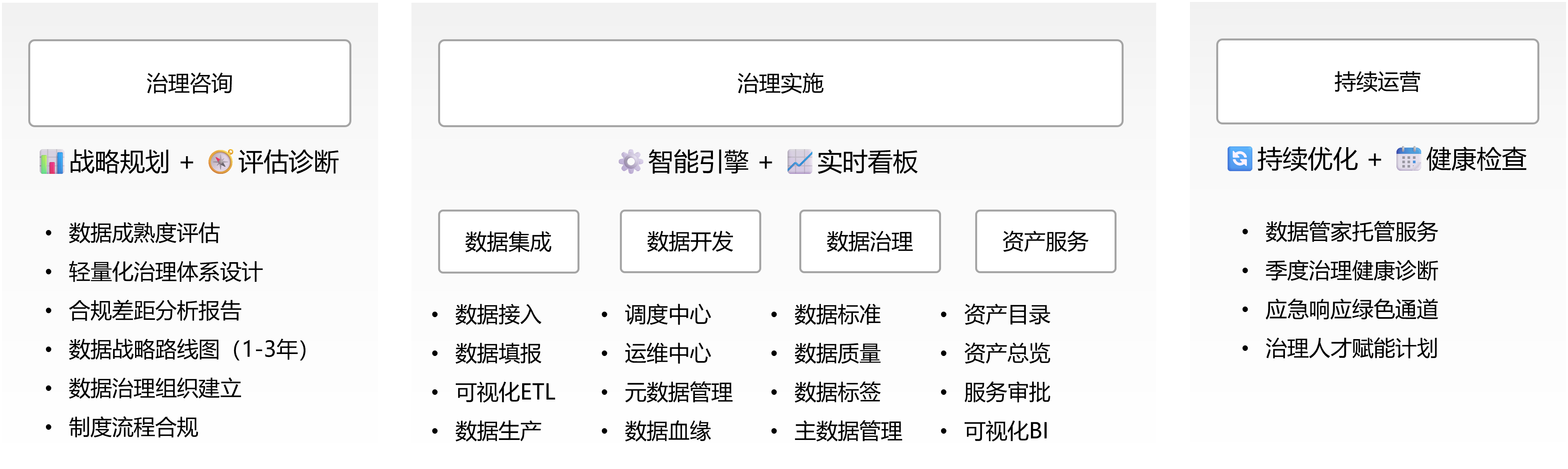 “樞理”從戰(zhàn)略高度出發(fā),開展數(shù)據(jù)治理咨詢。通過數(shù)據(jù)成熟度評估,精準(zhǔn)診斷企業(yè)數(shù)據(jù)管理現(xiàn)狀;設(shè)計輕量化治理體系,適配企業(yè)規(guī)模與業(yè)務(wù)特性;出具合規(guī)差距分析報告,保障數(shù)據(jù)管理符合行業(yè)規(guī)范。同時,繪制1 - 3年數(shù)據(jù)戰(zhàn)略路線圖,明確長期治理方向;協(xié)助建立數(shù)據(jù)治理組織,厘清職責(zé)分工;規(guī)范制度流程,讓數(shù)據(jù)治理“有章可循”,為后續(xù)治理筑牢頂層設(shè)計基礎(chǔ) 。